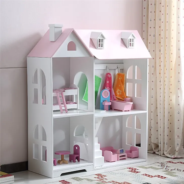 บ้านตุ๊กตาไม้สีขาวและสีชมพูเป็นพื้นที่เก็บของขนาดใหญ่ ใช้การออกแบบแบบทูอินวัน เด็กๆ สามารถวางหนังสือและตุ๊กตาได้มากขึ้น